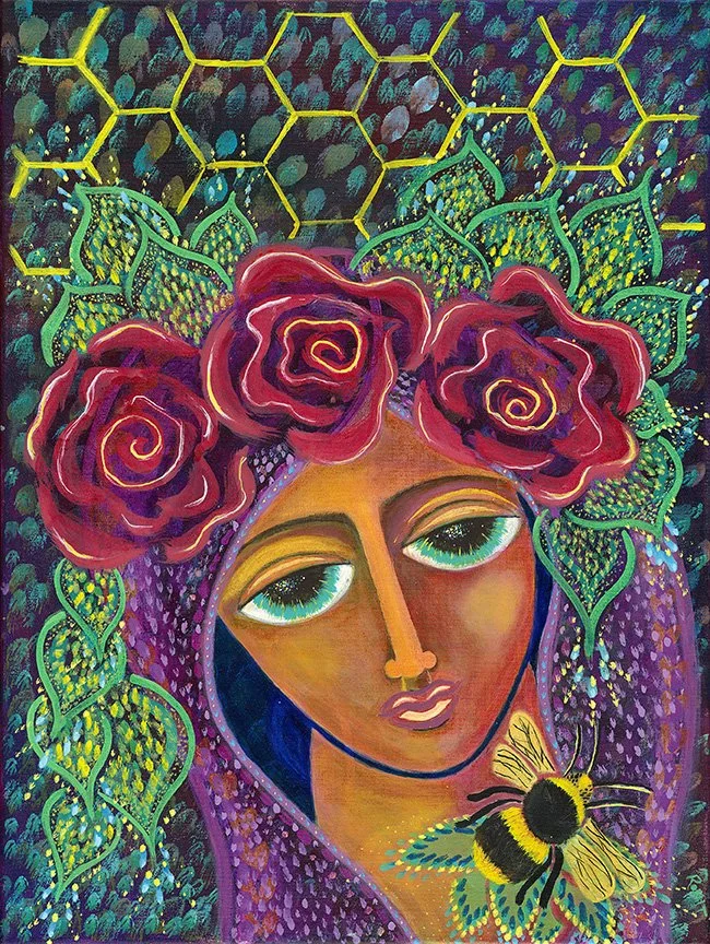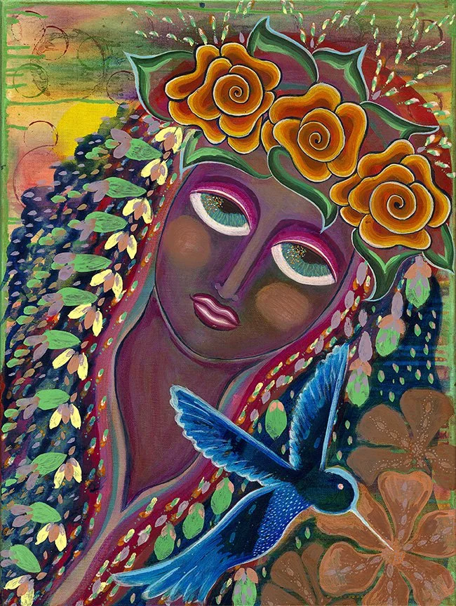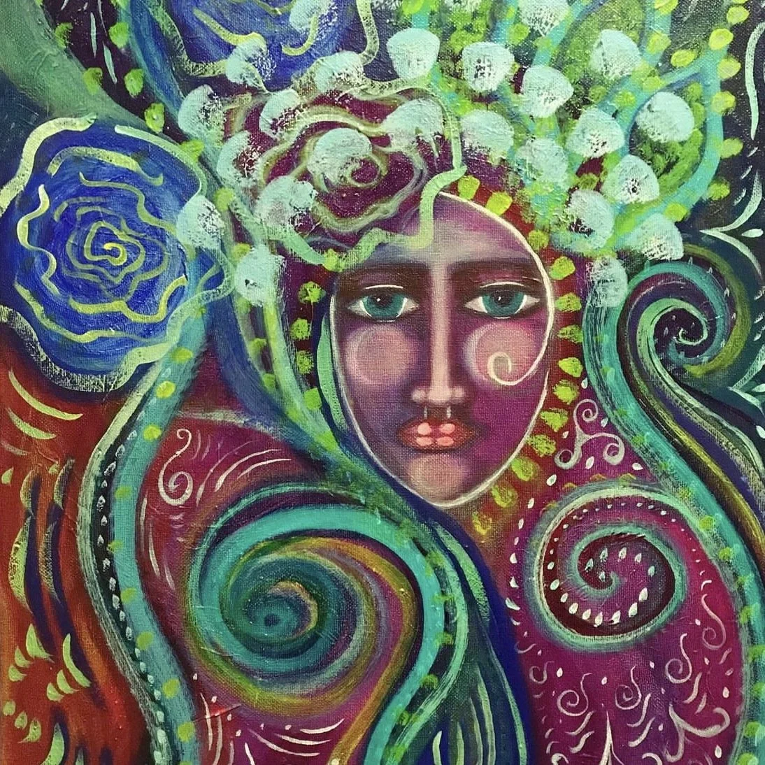 I create stylized images of women, nature, and symbols—interweaving the shamanic, collective, ancestral, with the deeply personal.